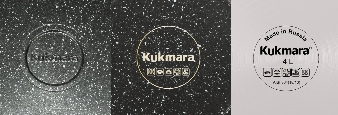 На ряде изделий алюминиевой посуды с АП для индукционных плит линий "Granit ultra Induction" и "Marble Induction": кастрюлях, кастрюлях-жаровнях, казанах, блинницах логотип «Kukmara» наносится  лазерным методом, на классических сковородах, сковородах-гриль с индукционным дном логотип отливается.